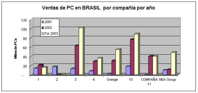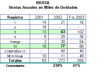Se anticipa un decrecimiento en ventas durante el ciclo Q9, es decir, el primer trimestre del 2,003. Algunos grupos como el de registro #4, así como el de registro #2 cuentan con muy poco inventario, probablemente se abastecerán de compras foráneas o de los mismos competidores. Así, se considera el mercado continuará creciendo, pero con menor vigor. El mercado emergente de Brasil Brasil, a pesar de la incertidumbre por el año electoral se comportó favorablemente para las compañías operantes en dicho país.